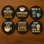 Playzia “Coffee Vibes” Wooden Coaster Set of 6 | Designer Multi-Color Round Coasters with Stand | Perfect for Coffee Mugs, Tea Cups & Dining Table Décor (3.5×3.5 Inch)
