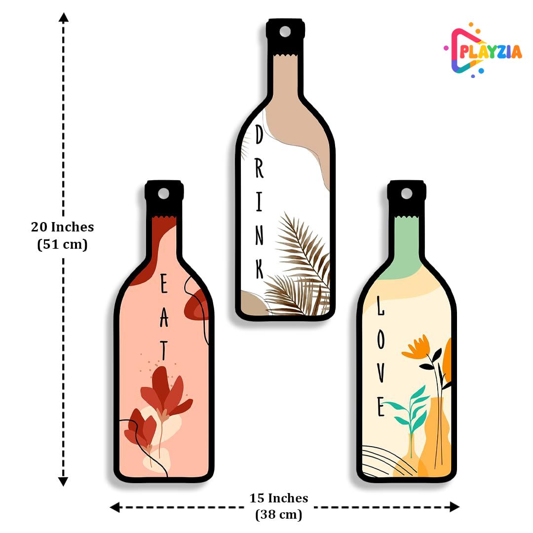Playzia “Eat Drink Love” 3-Bottle Wall Hanging | Modern Kitchen & Dining Room Wall Décor | Inspirational Wooden Art for Home