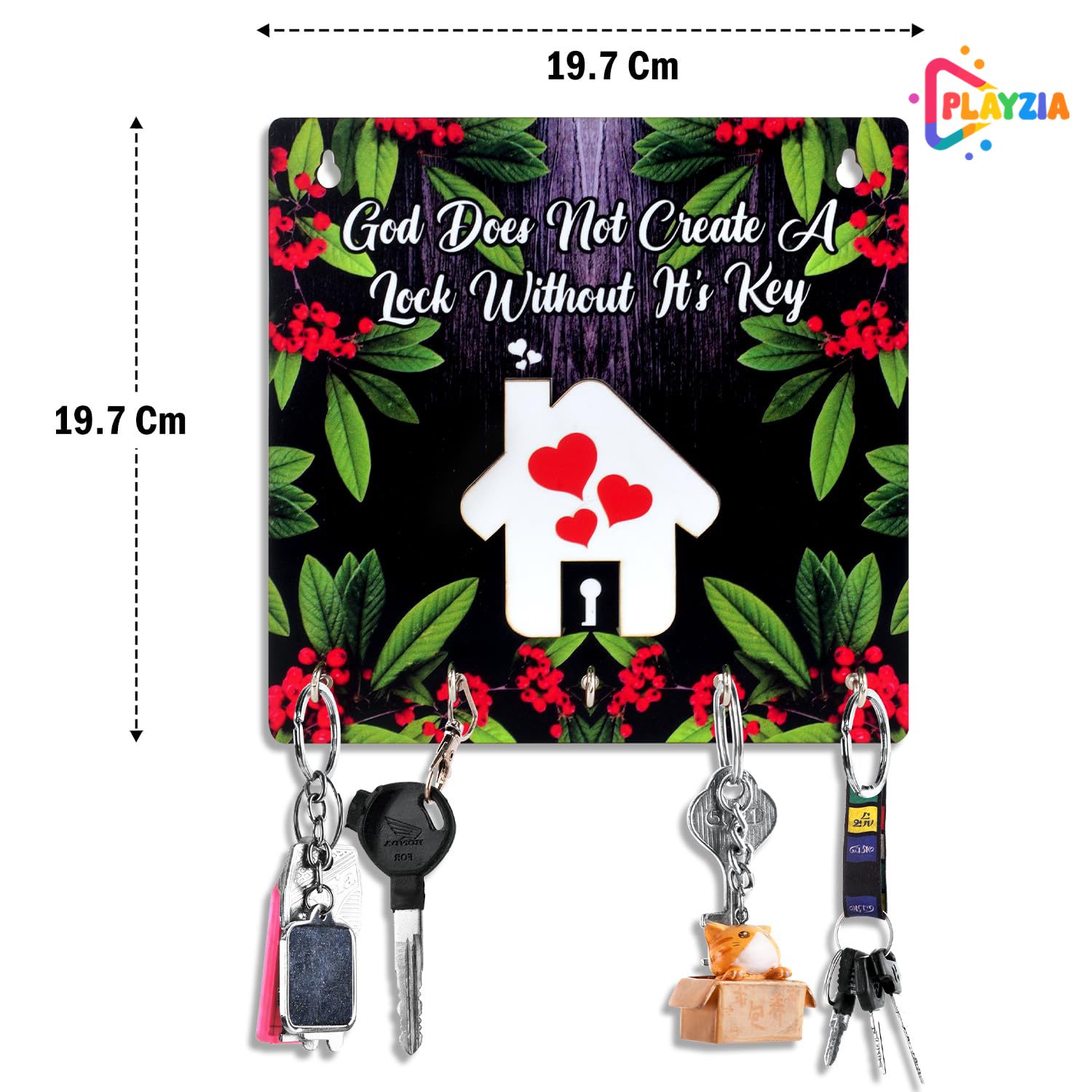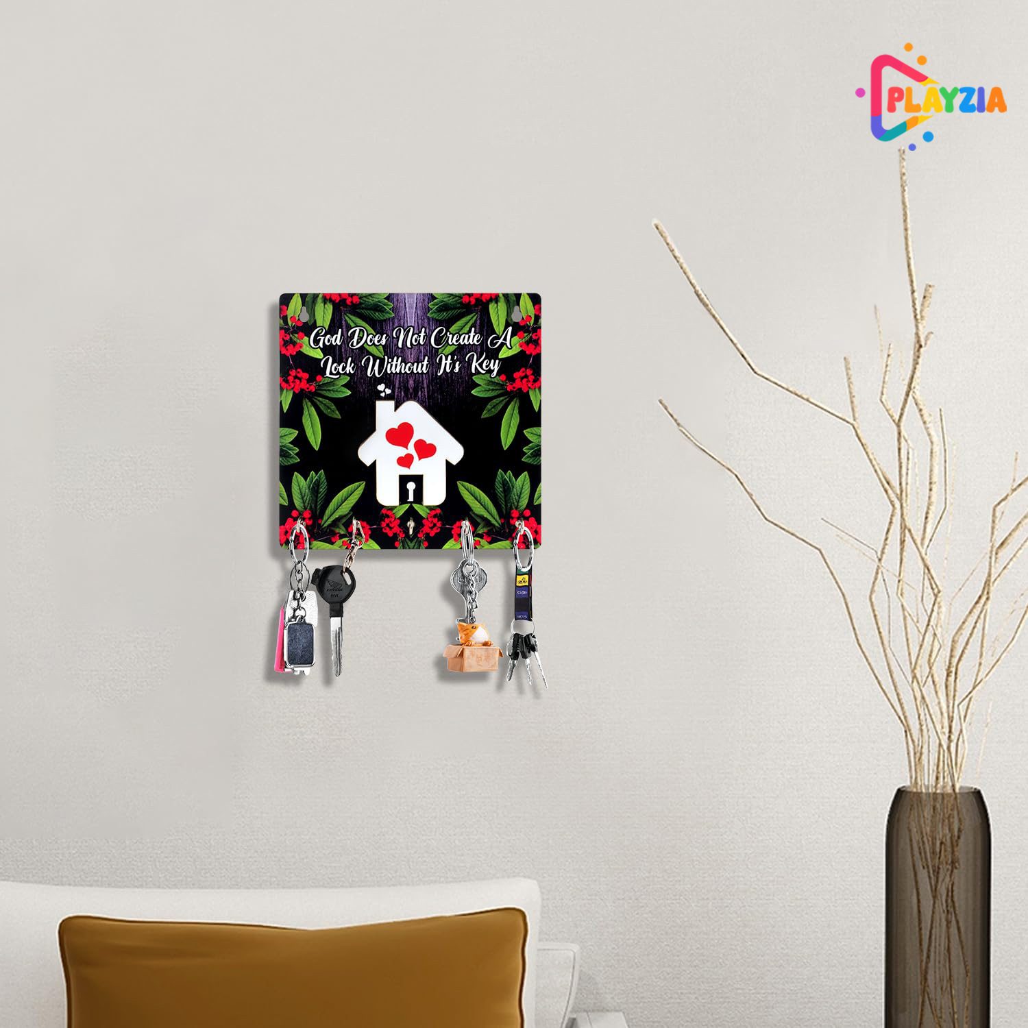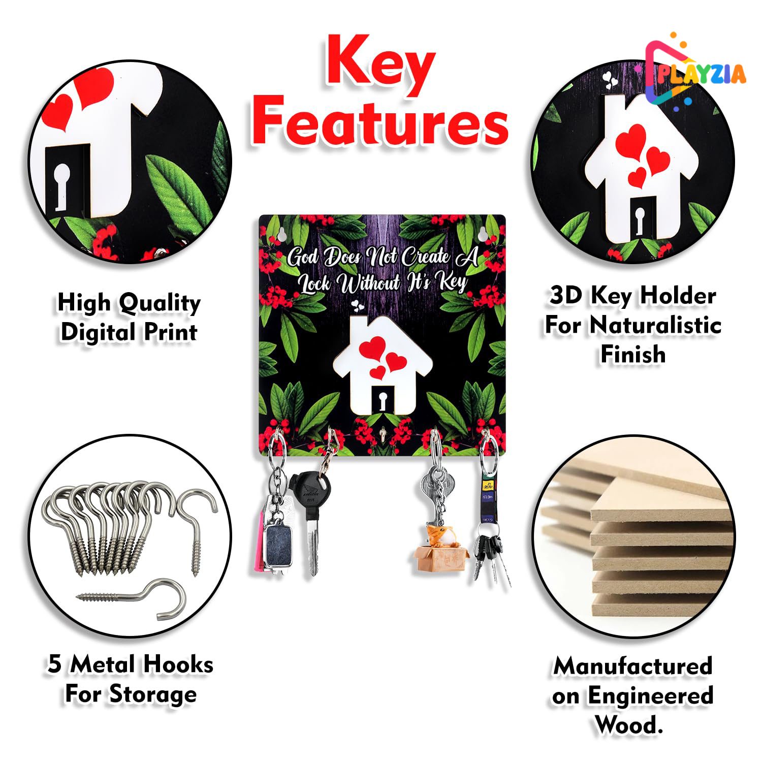 Playzia “God Does Not Create a Lock Without Its Key” Key Chain Holder for Wall | Wooden Key Hanger with 5 Hooks | Decorative Wall Mounted Organizer for Home & Office