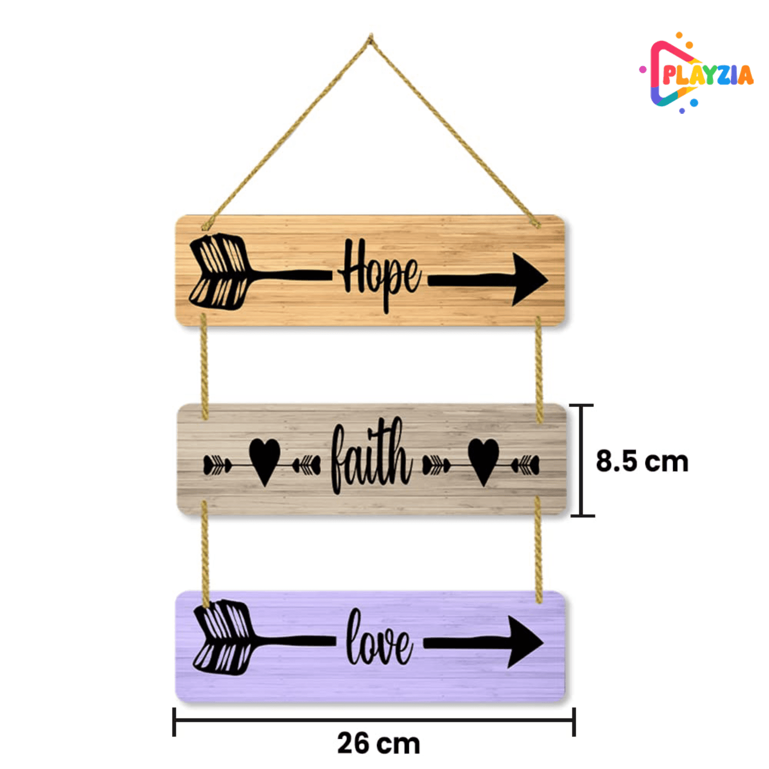 Playzia “Hope • Faith • Love” Wooden Wall Hanging | Inspirational Wall Décor for Stylish Living Room & Bedroom | Decorative Quote Wall Art for Home & Office