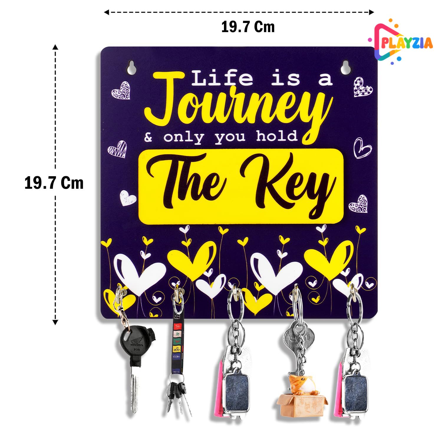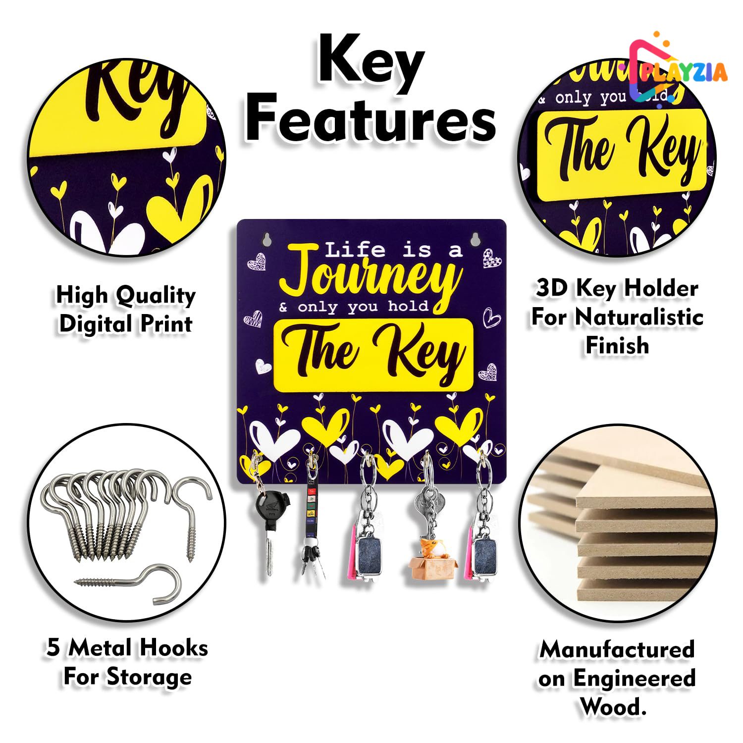 Playzia “Life is a Journey and Only You Hold the Key” Key Chain Holder for Wall | Wooden Key Hanger with 5 Hooks | Decorative Wall Mounted Organizer for Home & Office