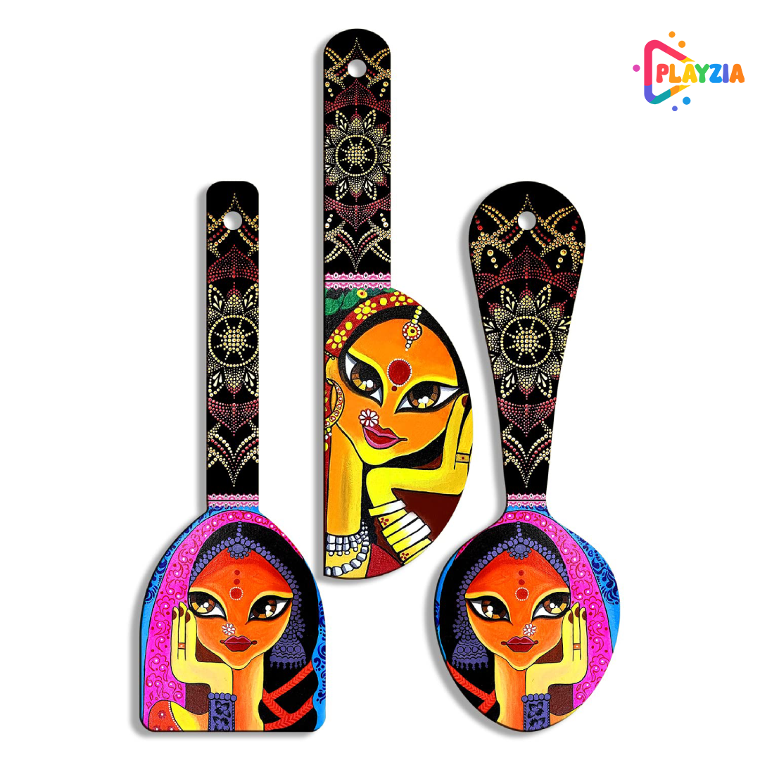 Celebrate Indian heritage with the Playzia “Madhubani Art Spoon Set” Wooden Wall Hangings. Featuring intricate folk-style artwork in vibrant hues, this 3-piece spoon-shaped panel set adds cultural richness and warmth to your home décor—perfect for living rooms, hallways, offices, and gifting.