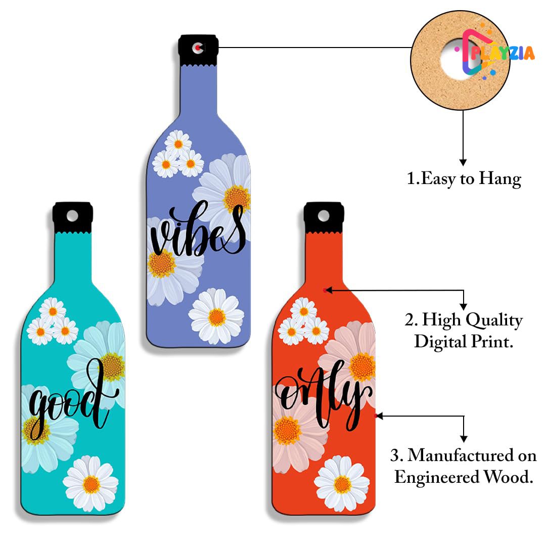 Playzia “Good Vibes Only” 3-Bottle Wall Hanging | Positive Quote Wooden Wall Décor | Stylish Living Room & Bedroom Hanging Frame