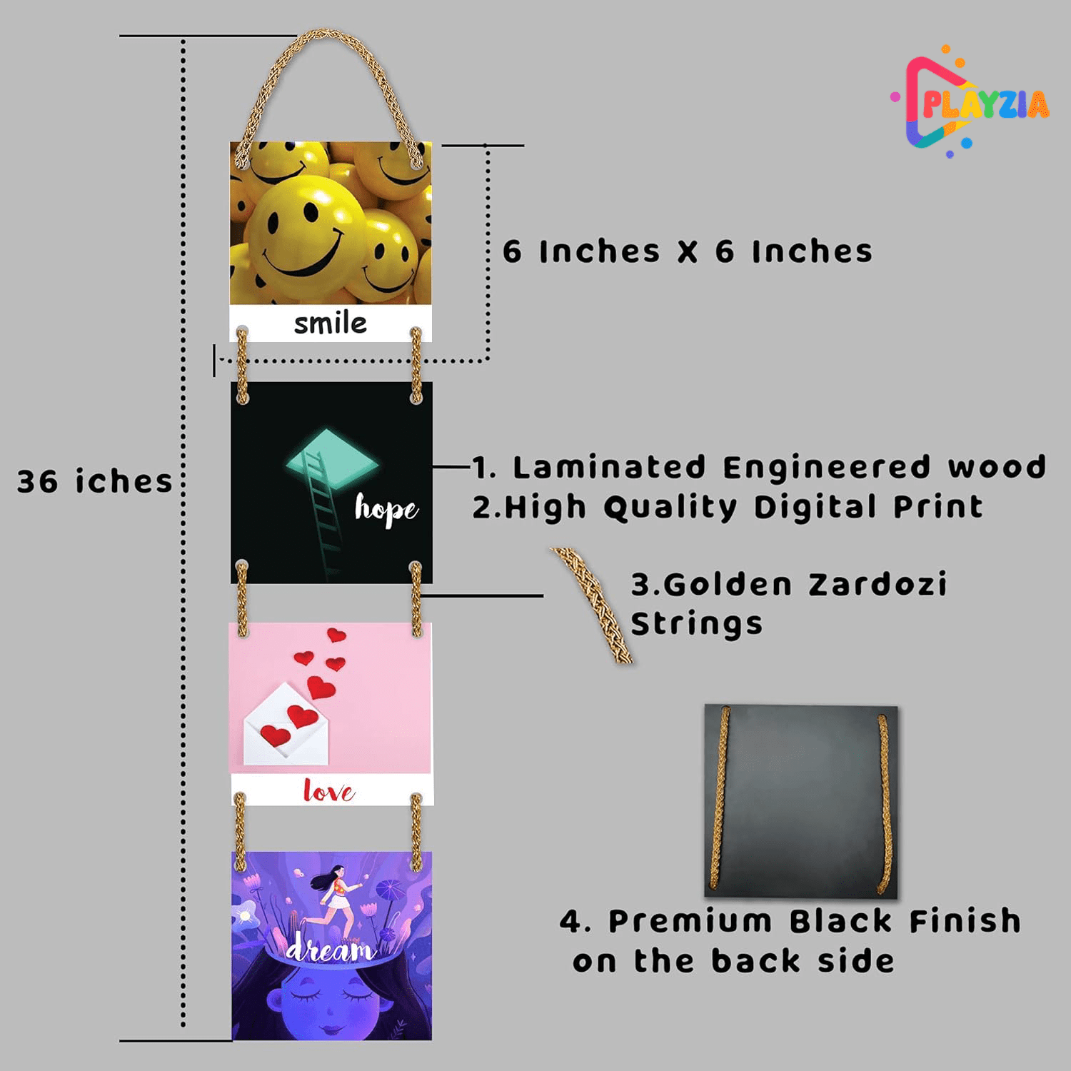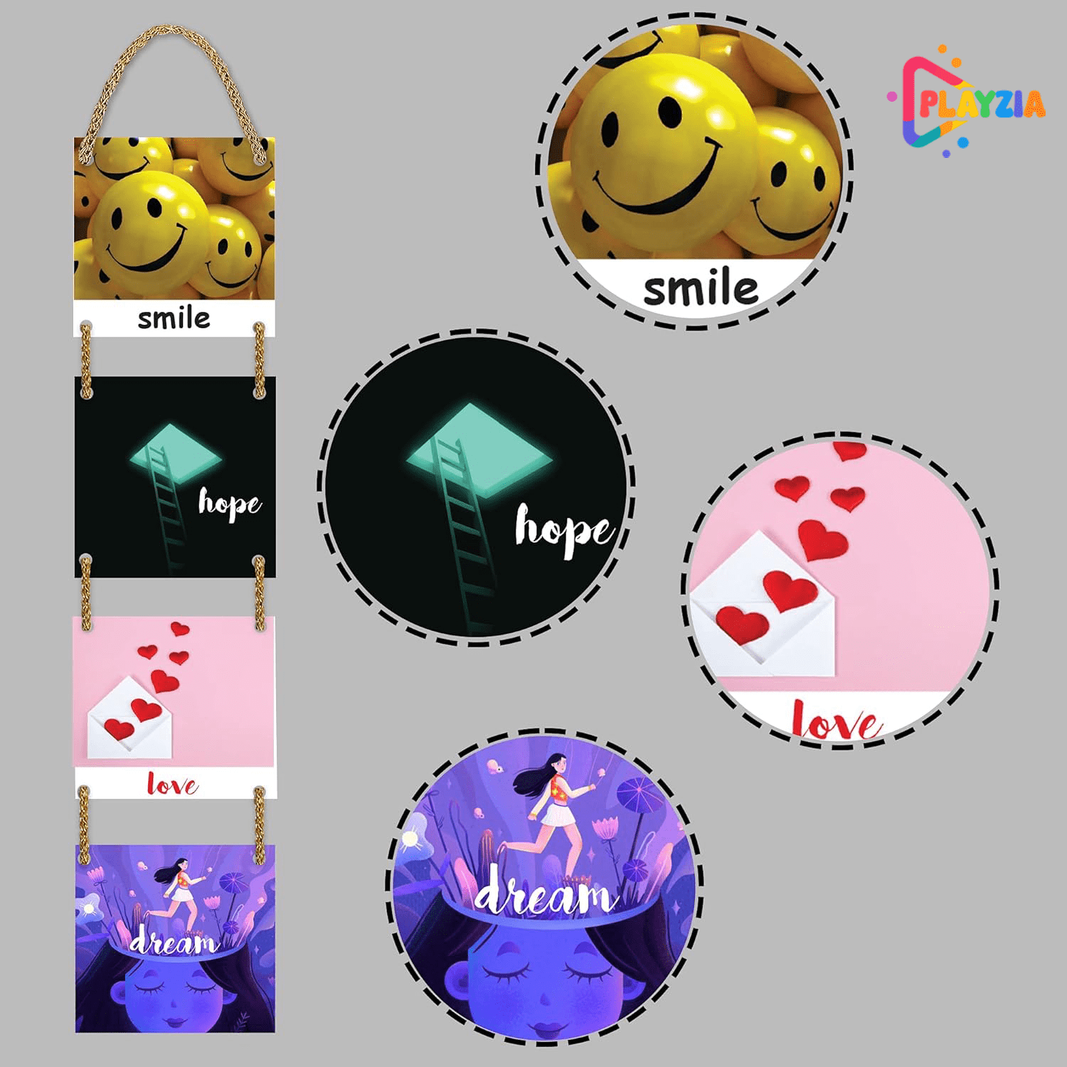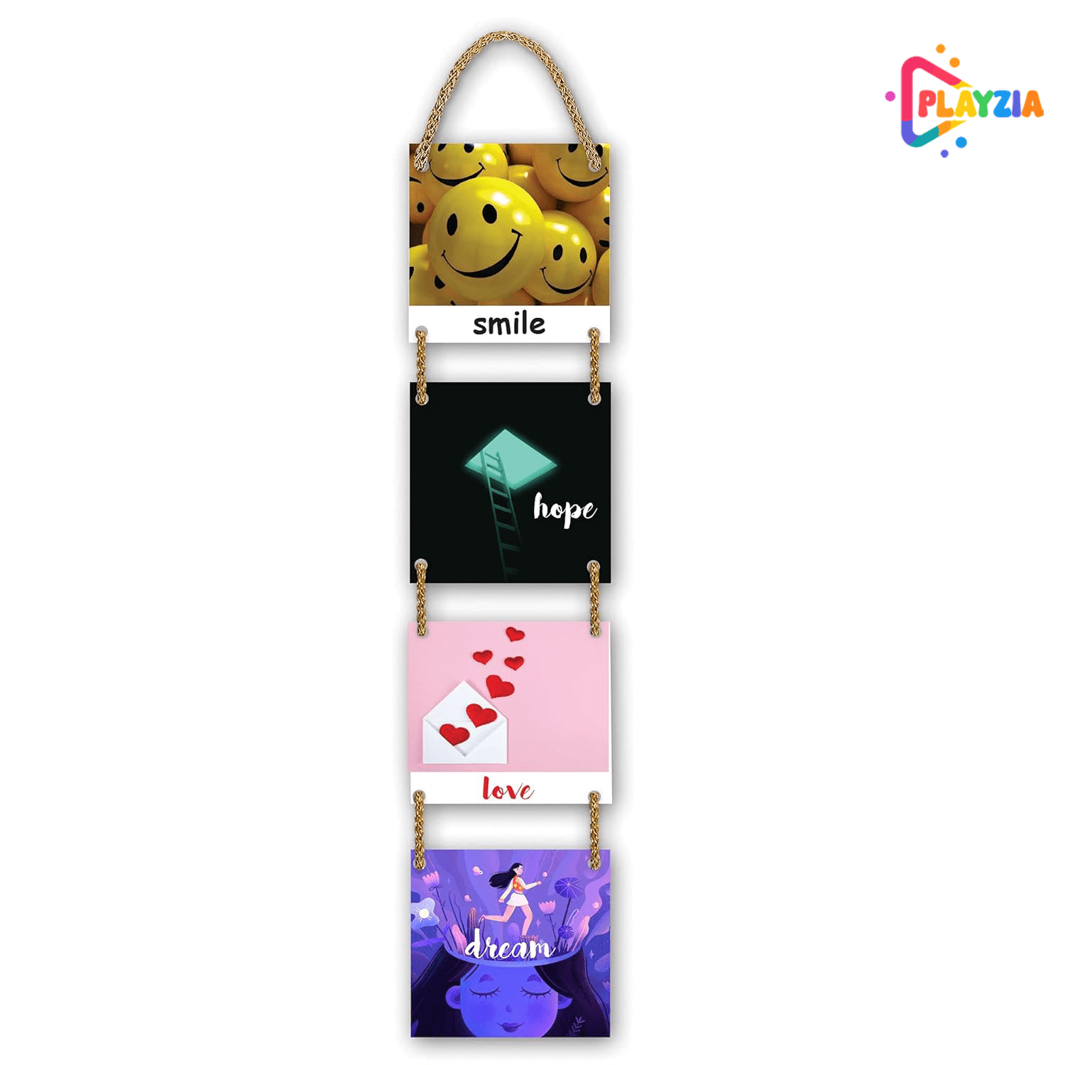 Playzia “Smile • Hope • Love • Dream” Multilayer Wooden Wall Hanging | 4-Piece Square Panel Wall Décor for Living Room & Bedroom | Stylish Modern Home Decoration Art Frames