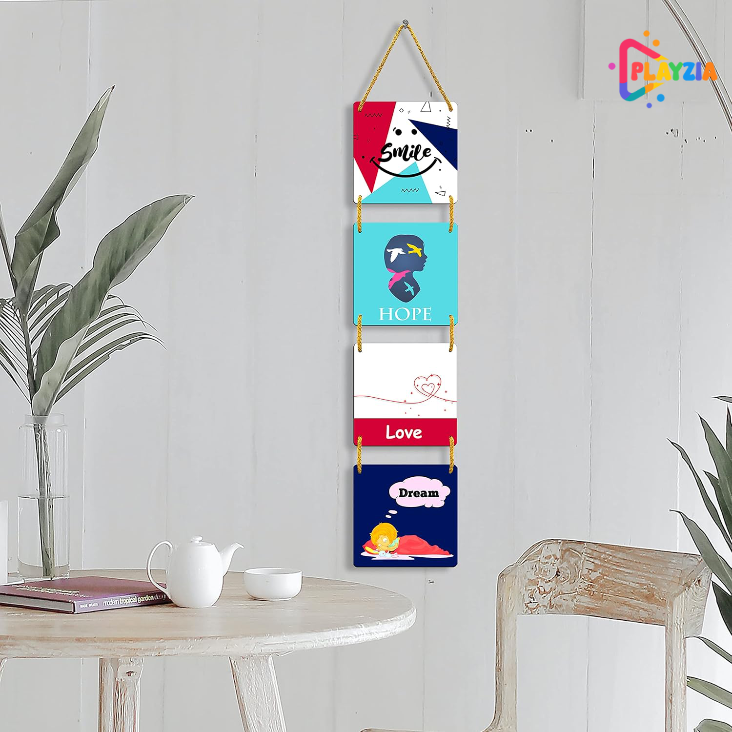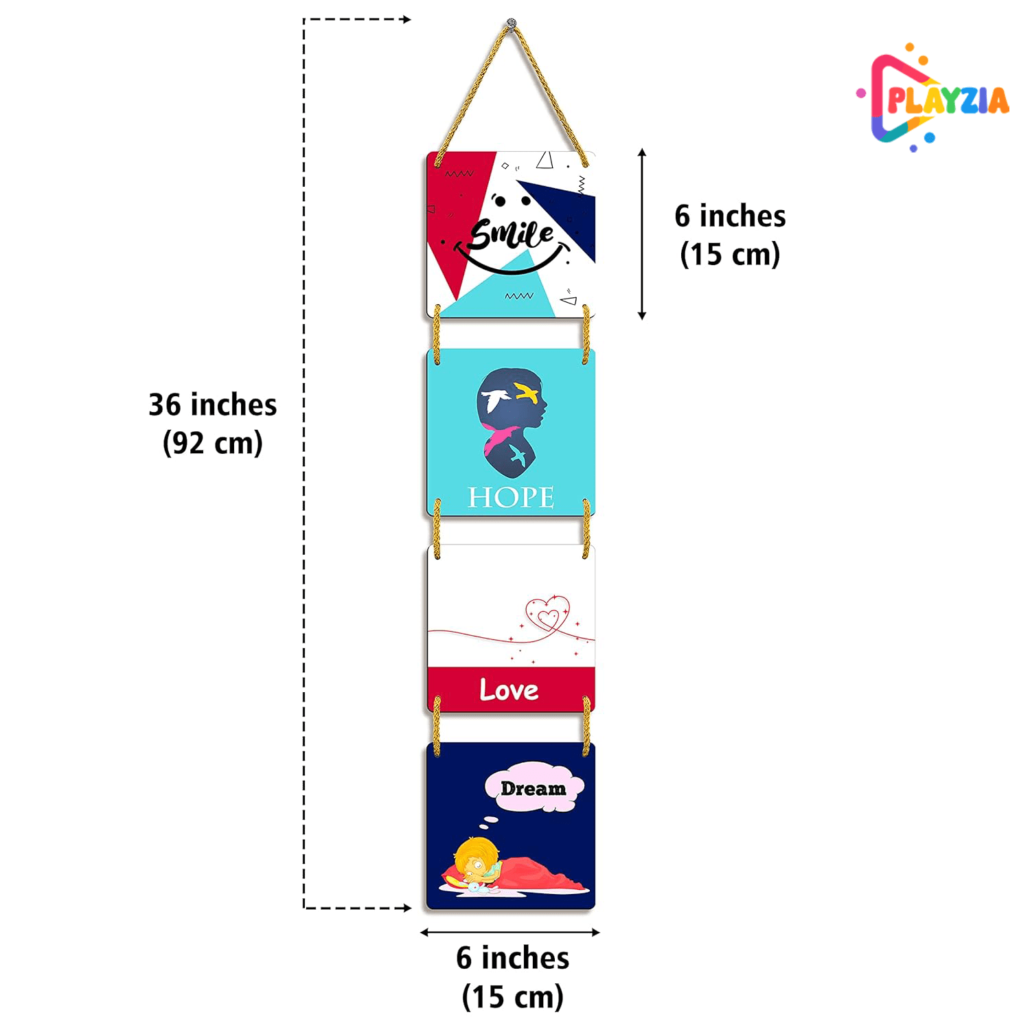 Bring warmth and positivity into your home with the Playzia “Smile • Love • Hope” 4-Square Multilayer Wooden Wall Hanging. Crafted with layered MDF and a smooth matte finish, this stylish décor set is perfect for living rooms, bedrooms, offices, cafés, and modern spaces.