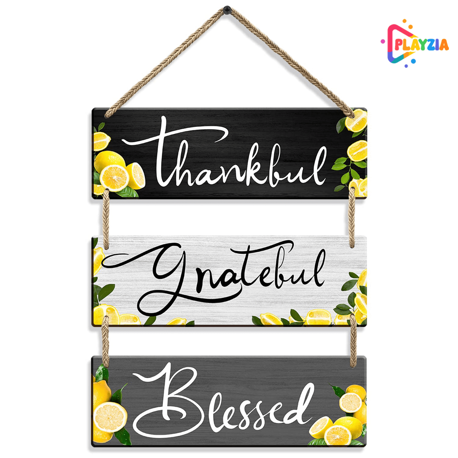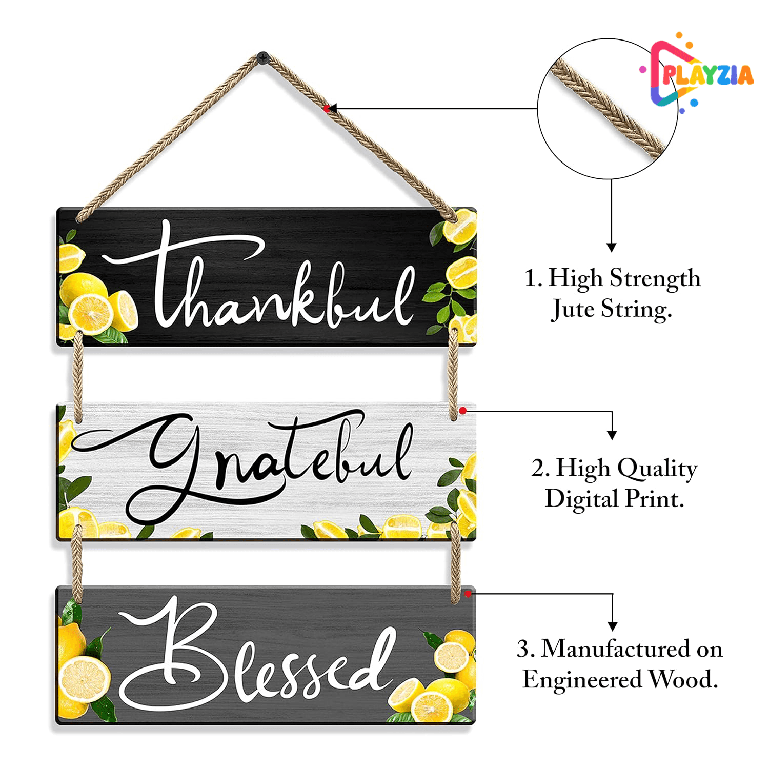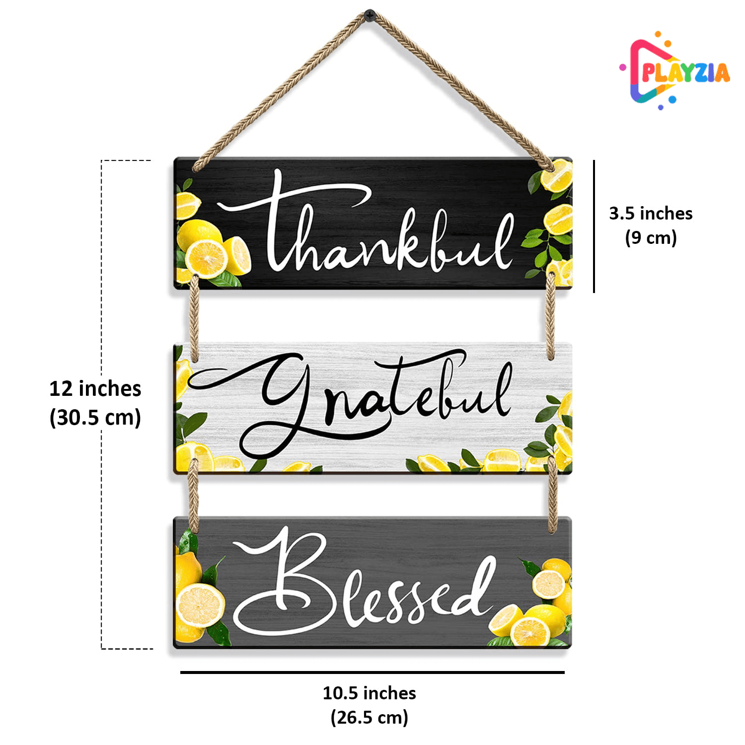 Playzia “Thankful • Grateful • Blessed” Wooden Wall Hanging | Inspirational Wall Décor for Living Room & Bedroom | Decorative Wooden Wall Art | Home & Office Decoration Item